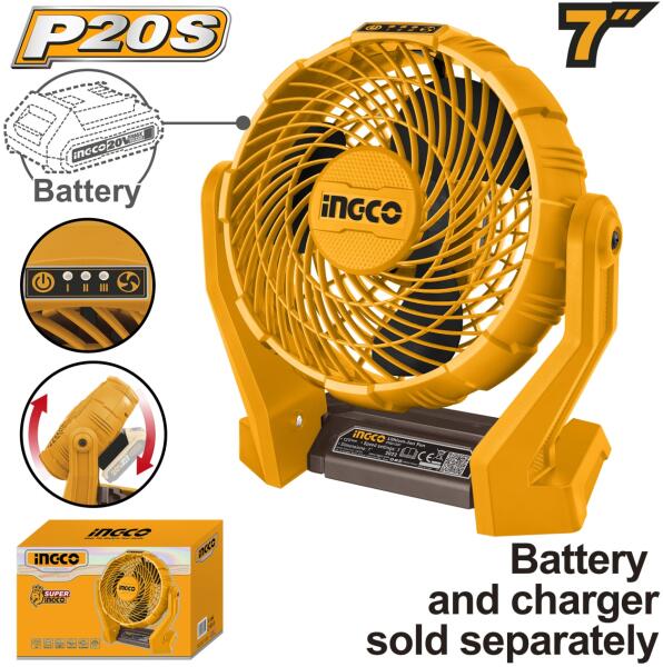 Az INGCO CFALI2007 egy kompakt és hordozható akkumulátoros ventilátor , amely ideális választás műhelybe, építkezésre, irodába vagy akár otthoni használatra. A 180 mm-es lapátátmérő hatékony légáramlást biztosít, a vezeték nélküli 20 V-os kialakítás pedig teljes mozgásszabadságot nyújt bármilyen környezetben. A ventilátor könnyű, ergonomikus kialakítású , és egyszerűen elhelyezhető akár munkaasztalon, polcon vagy a földön is. A több sebességfokozat lehetővé teszi a légáramlás igény szerinti szabályozását. Főbb jellemzők: