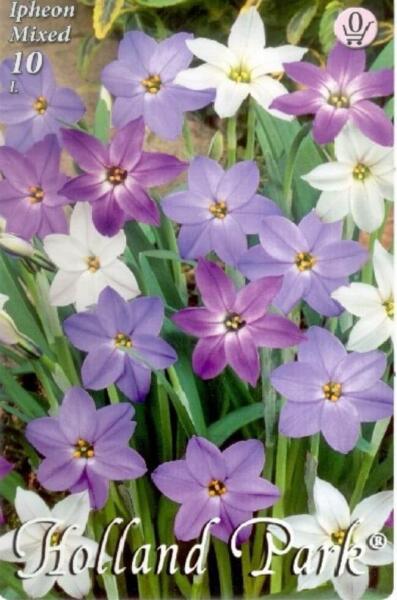 Ipheon Mixed vegyes csillaghagyma virághagymák Virághagyma körmérete: I Javasolt ültetési ideje: VIII. -X. Virágzás ideje: III. -V. Javasolt ültetési távolság: 6 cm Javasolt ültetési mélység kb. : 8 cm Növény várható magassága kb. : 15 cm Az egyvirágú csillaghagyma vagy ibolyás csillaghagyma (Ipheion uniflorum) alacsony termetű, tavasszal virágzó hagymás, évelő növény, mely Argentína és Uruguay területén őshonos. Termesztett állományból származó növény. Származási hely: EU
