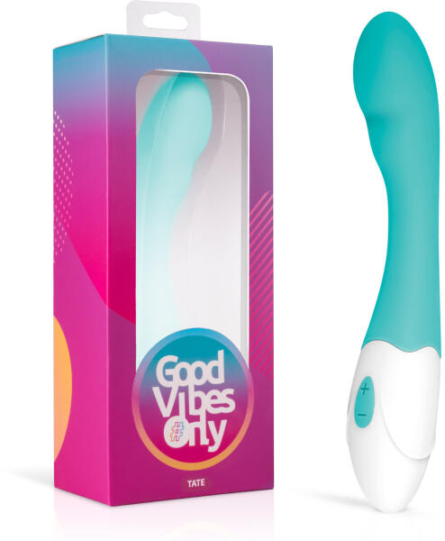 A Good Vibes Only új, változatos, ergonomikusan tervezett vibrátorokat kínál élénk színekben! Mindenki megtalálhatja a számára megfelelőt!  TATE vibrátor gyönyörű türkiz színben teljesen elvarázsol a formájával, amely biztosítja a G-pont stimulációját! Hajlított, vastagított, aszimmetrikus vége eléri a legérzékenyebb pontodat. Selymesen sima és kiváló minőségű, ftalátmentes szilikonból készült. Javasoljuk, hogy vízbázisú síkosítóval használd. 10 különböző rezgéssel rendelkezik, amelyeket egy kényelmes gombbal lehet irányítani. A + gomb néhány másodpercig tartó megnyomásával kapcsolhatod be a rezgéseket, majd a + és - gombokkal szabályozhatod a rezgések intenzitását. A - gomb hosszú megnyomásával kapcsolhatod ki. Igen, ilyen egyszerű!