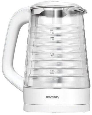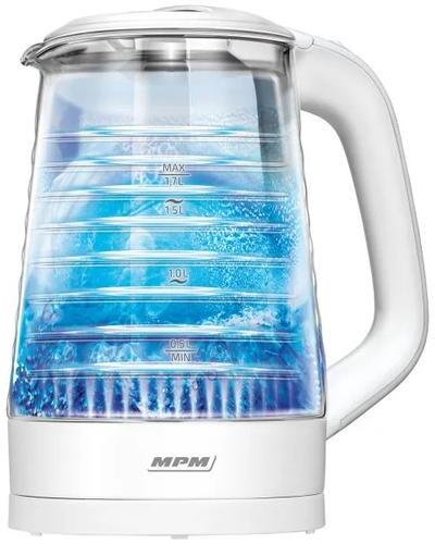 MPM üveg vízforraló 1,7 literes kapacitással és 2200W teljesítménnyel. Üveg és műanyag testtel, csuklós vezetővel, 360 fokban forgatható talppal és rejtett fűtőelemmel. Szűrővel a fedélben, ideális gyors és higiénikus vízforraláshoz.